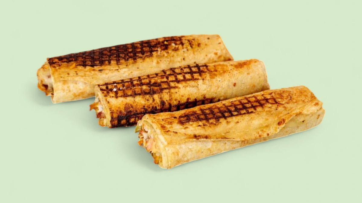Schawarma in Brot gerollt und gegrillt, mit Knoblauchpaste und Salzgurken, wahlweise mit Salat