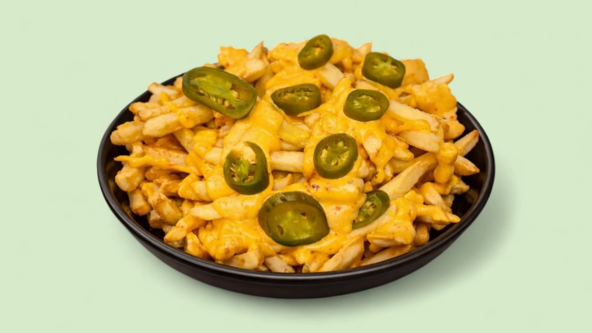 mit Pommes, Knusprigem Hähnchen , Jalapenos , gerösteten Zwiebeln, Mais, Knoblauchsoße und Chili Cheese Soße
