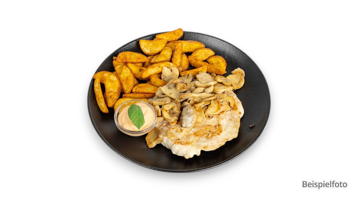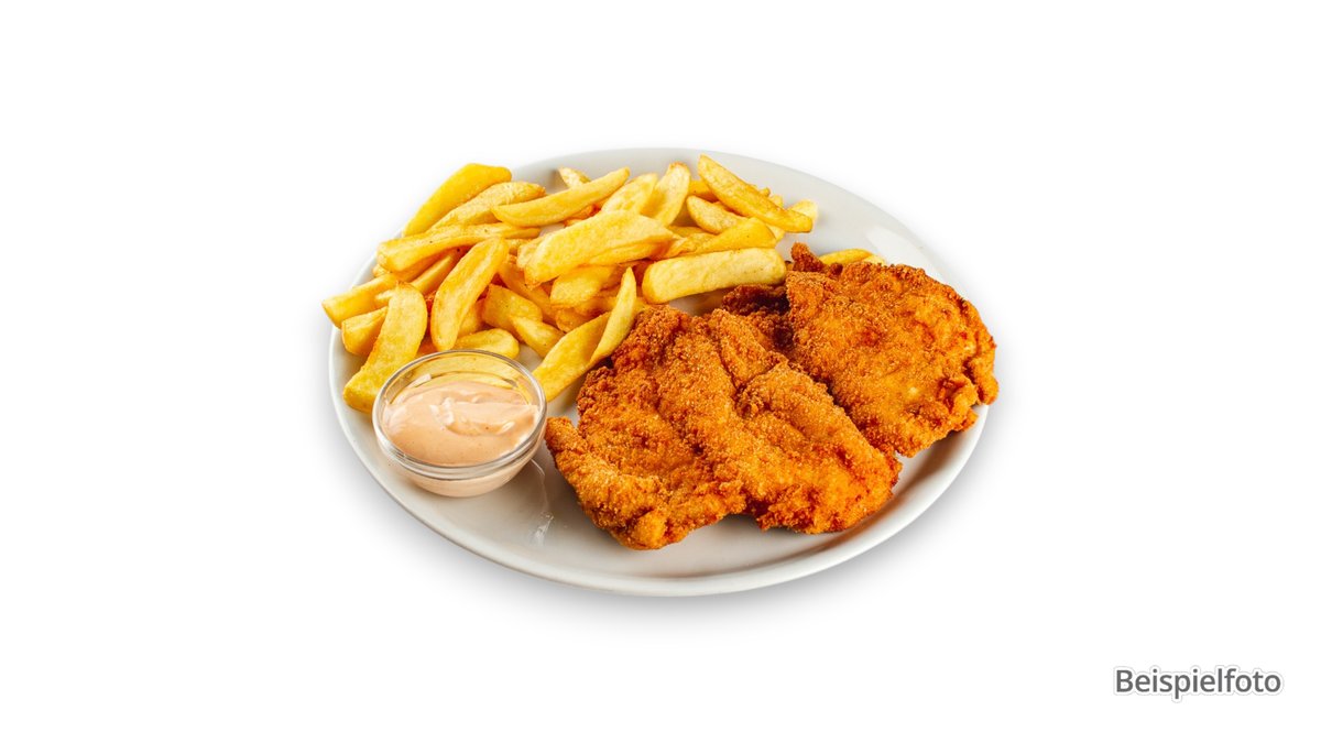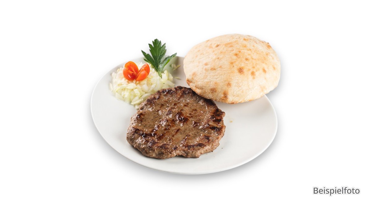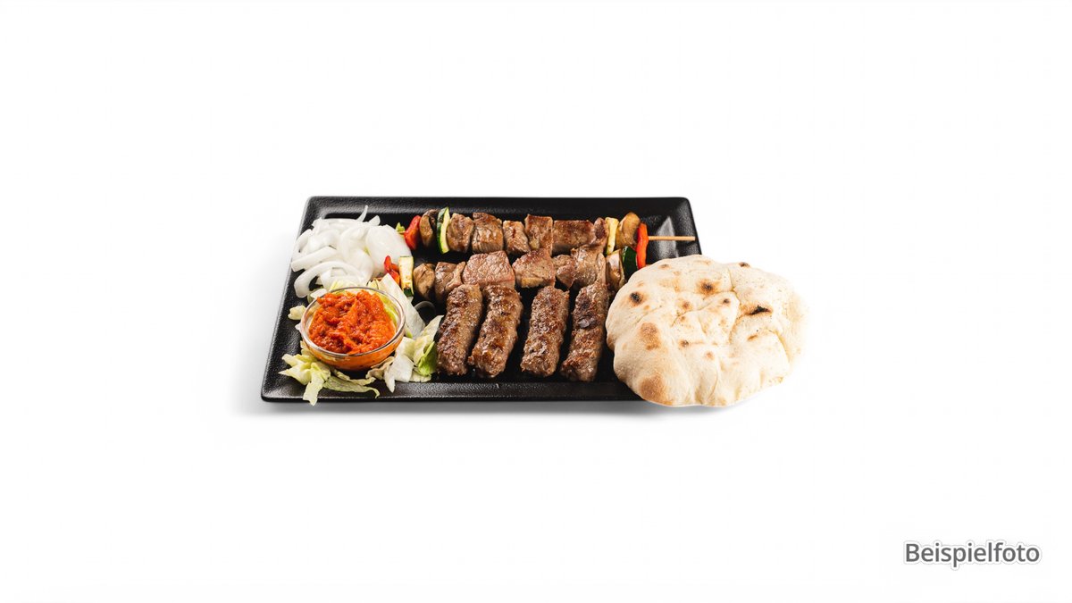 Für 1 Person Fladenbrot, Cevapcici vom Kalb, Hähnchenschnitzel, Kalbsteak, Rippchen vom Kalb, Gemüse und Pommes frites