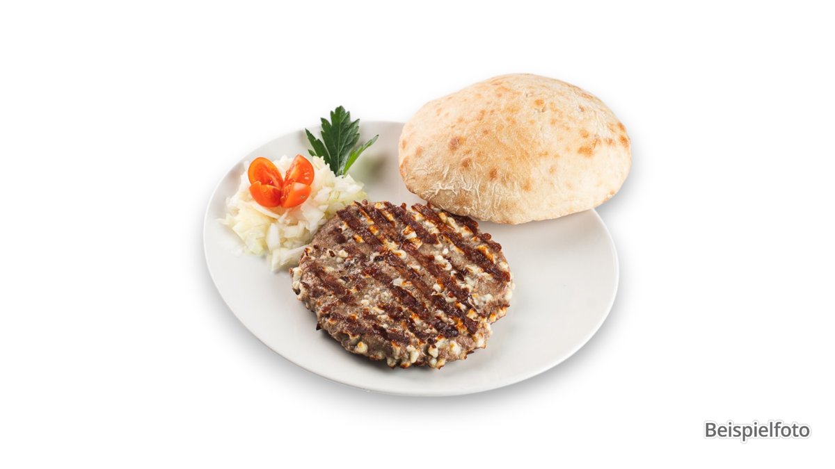 Balkan-Hacksteak vom Kalb mit Fladenbrot, Salat, Zwiebeln und Kajmak