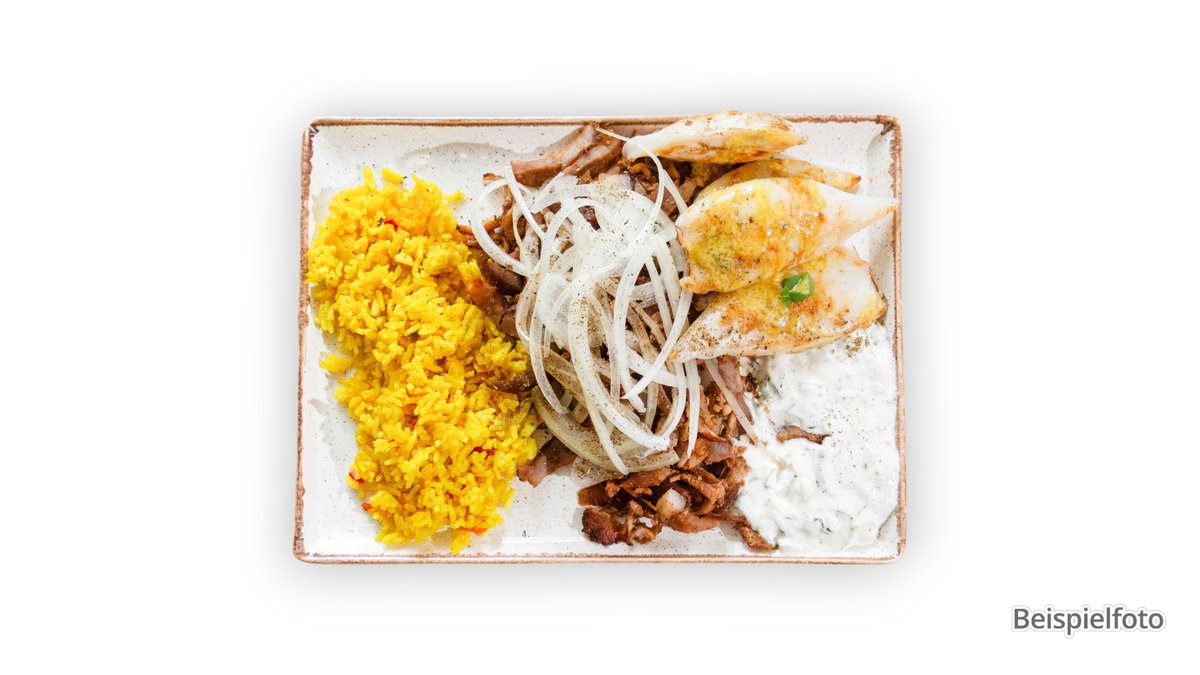 mit Gyros, Lammspießfilet, Reis, Tsatsiki und gemischtem Salat