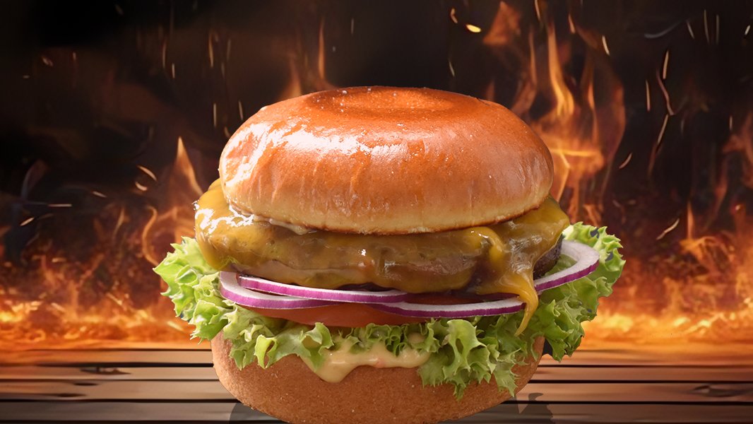 Mit Salat, Tomate, Zwiebeln, Magic Onion SoĂźe, Rindfleisch Patty und Cheddar im Brioche Bun.