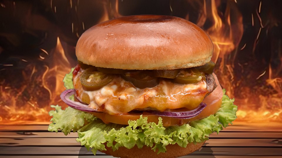 Mit Salat, Tomate, Zwiebeln, Chili-Thai, Rindfleisch Patty, Jalapeños, Mayonnaise und Cheddar im Brioche Bun.
