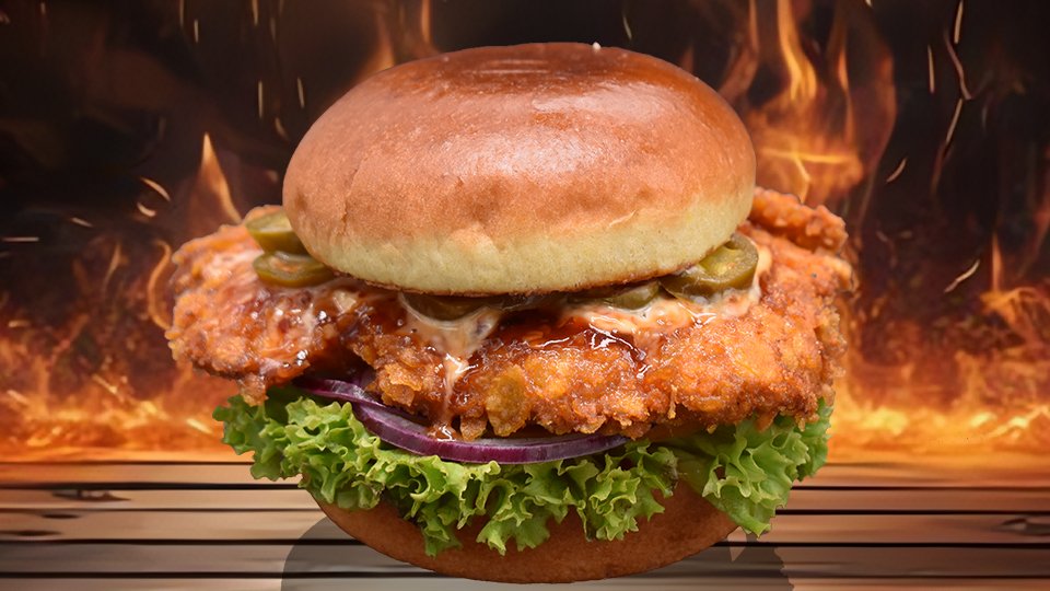 Mit Salat, Tomate, Zwiebeln, Chili-Thai Soße, mariniertem und paniertem Hähnchen, Jalapeños und Mayonnaise im Brioche Bun.