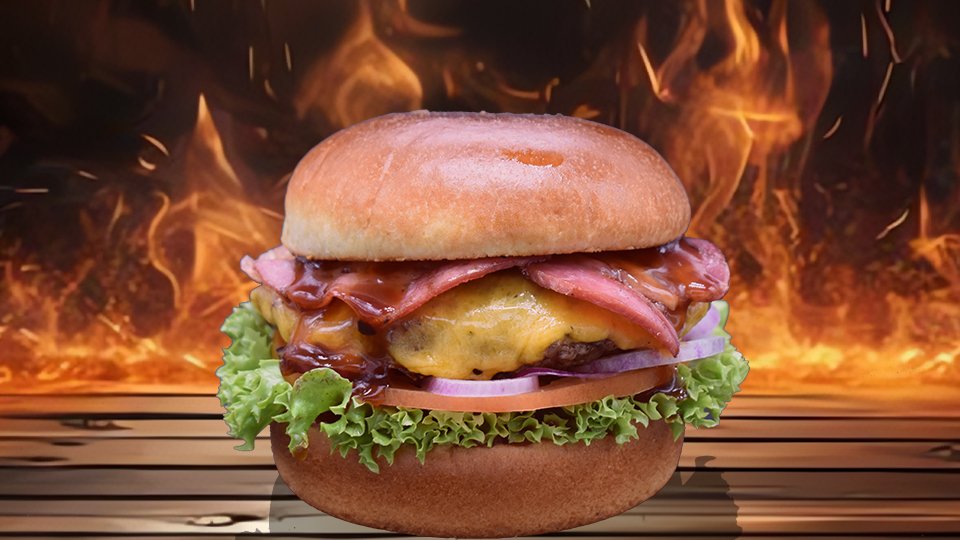Mit Salat, Tomate, Zwiebeln, BBQ Sauce, Rindfleisch Patty, Cheddar und Rinder-Bacon im Brioche Bun.