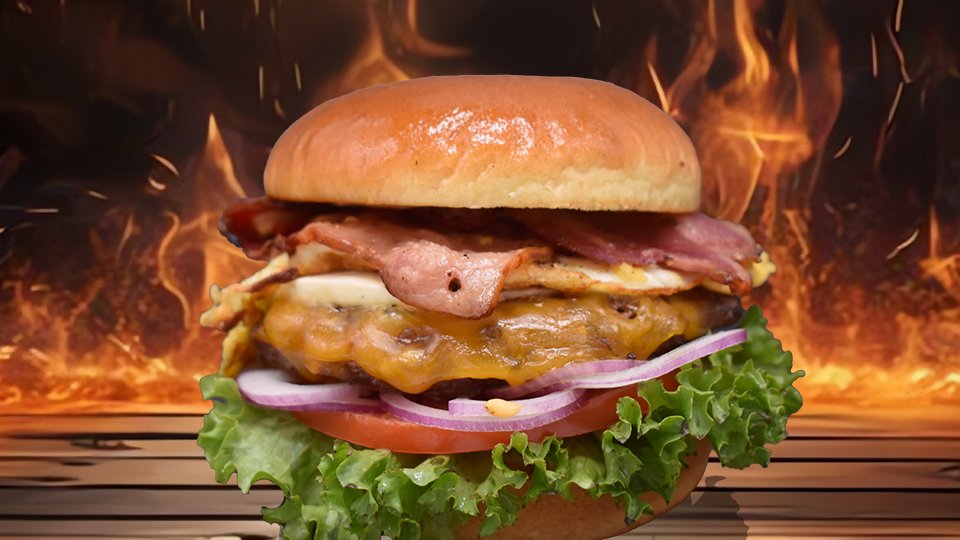 Mit Salat, Tomate, Zwiebeln, Magic Onion Soße, Rindfleisch Patty, Cheddar, Hirtenkäse, Ei und Rinder-Bacon im Brioche Bun.