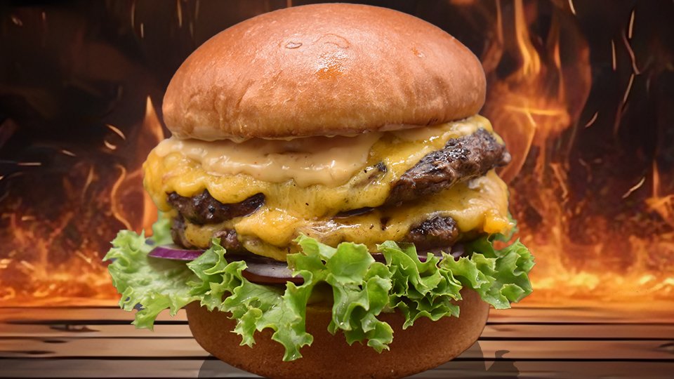 Mit Salat, Tomate, Zwiebeln, Magic Onion, 2x Rindfleischpatty und 2x Cheddar im Brioche Bun.