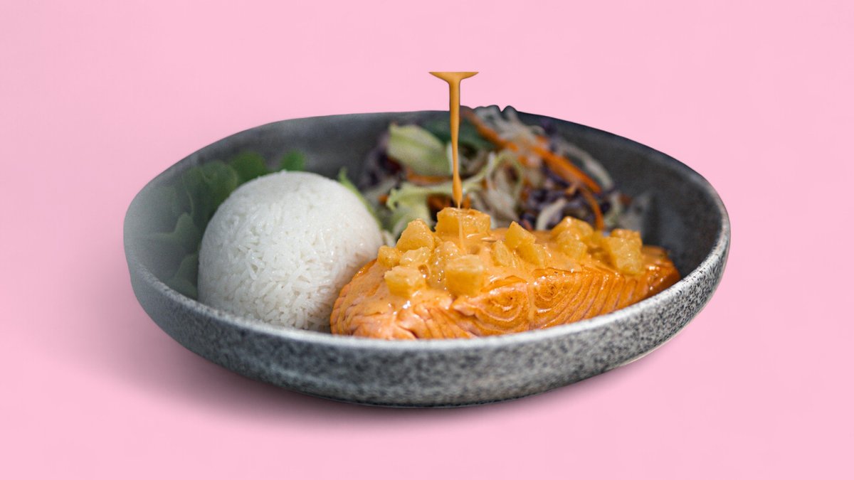 Lachssteak in leicht sĂĽĂźlicher Mangocurry-SoĂźe mit frischem Salat und Reis