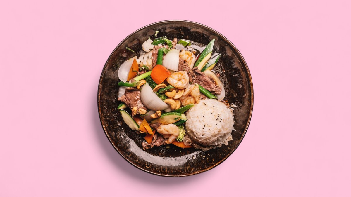 Rindfleisch und Garnelen scharf angebraten mit Zwiebeln, Paprika, Cashewkernen und Reis