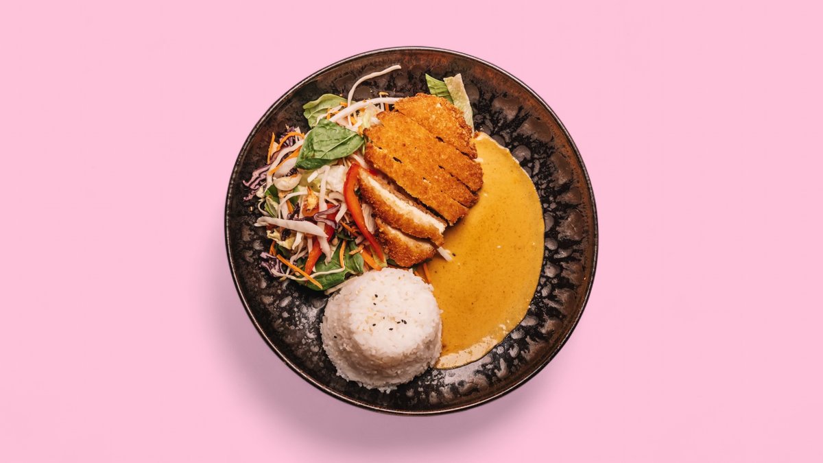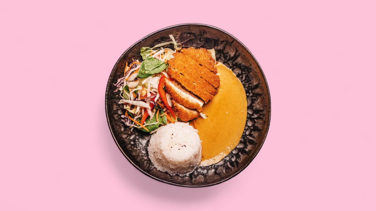 Knuspriges Hühnerbrustfilet mit Salat, Erdnußsoße und asiatischen Kräutern und Reis
