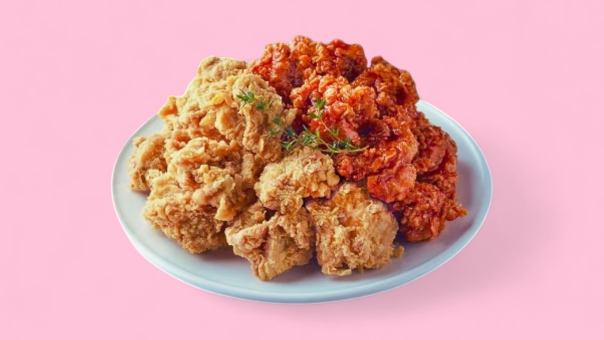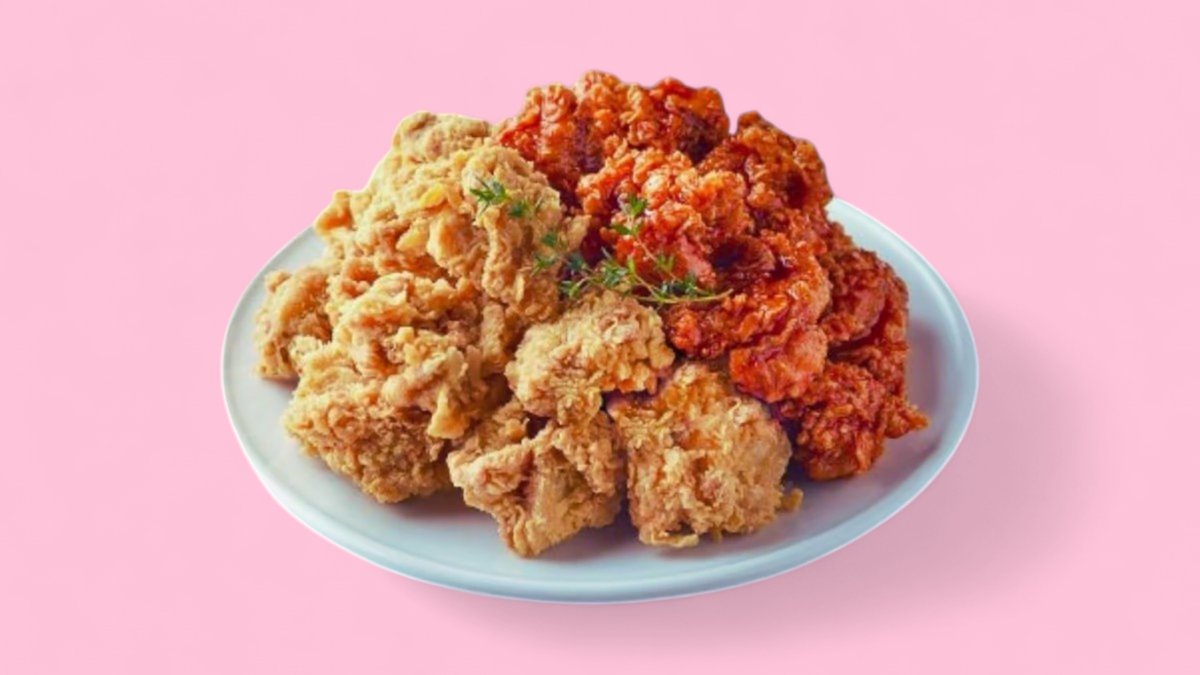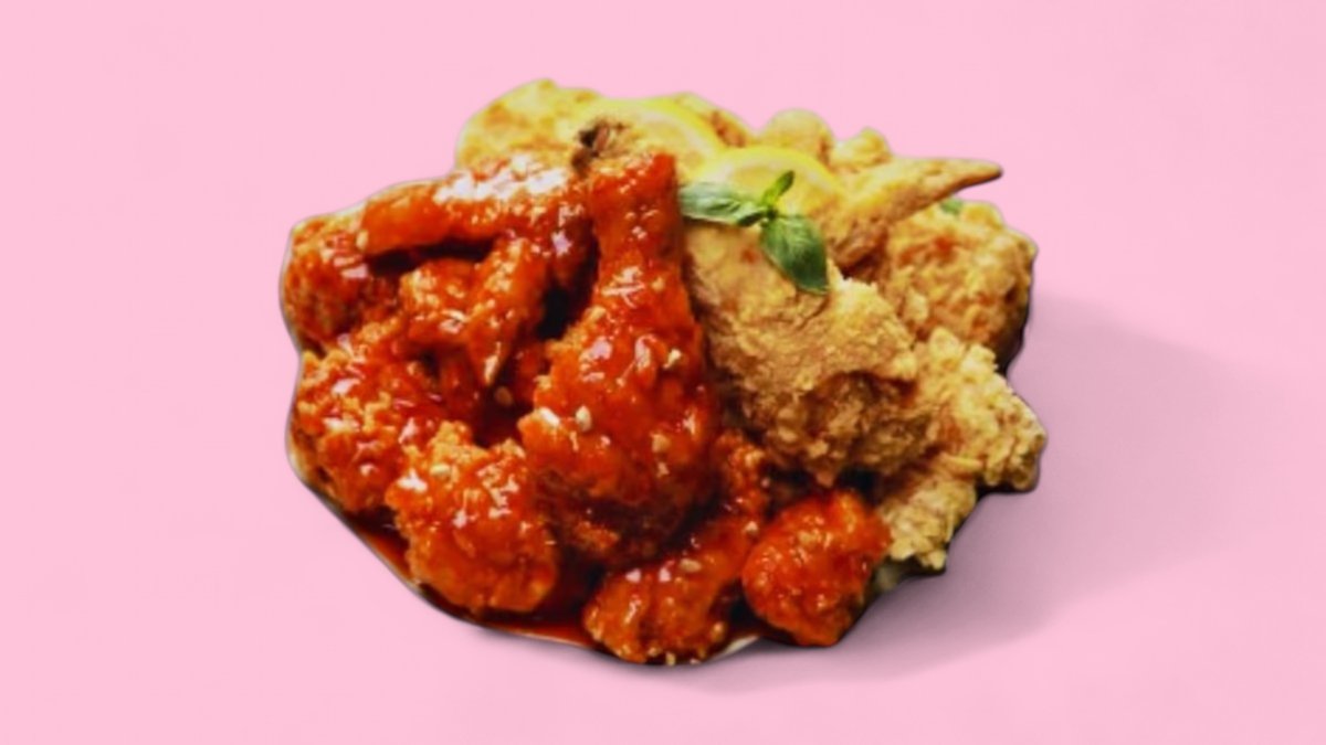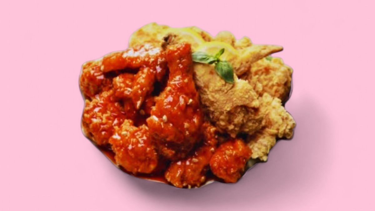 Eine beliebte Art, koreanisches Hühnchen in Südkorea zu essen. Die Hälfte der Hähnchenkeulen kommt ohne Soße, um den Geschmack auszugleichen.