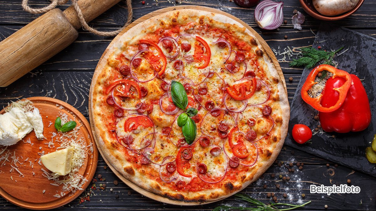 mit Salami, Schinken, frischen Champignons, Zwiebeln und Peperoni