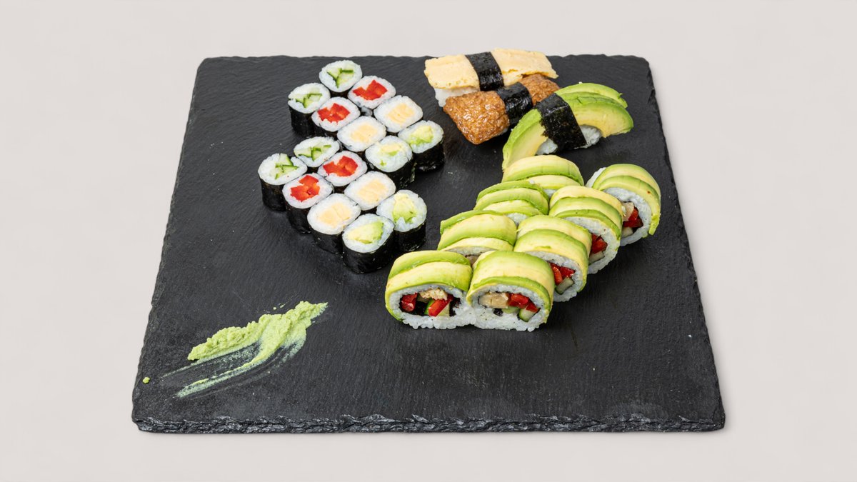27 Stück 4x Avocado Maki 4x Kappa Maki 4x Paprika Maki 4x Tamago Maki 8x Veggie Ampel Inside Out 1x Inari Nigiri 1x Avocado Nigiri 1x Tamago Nigiri