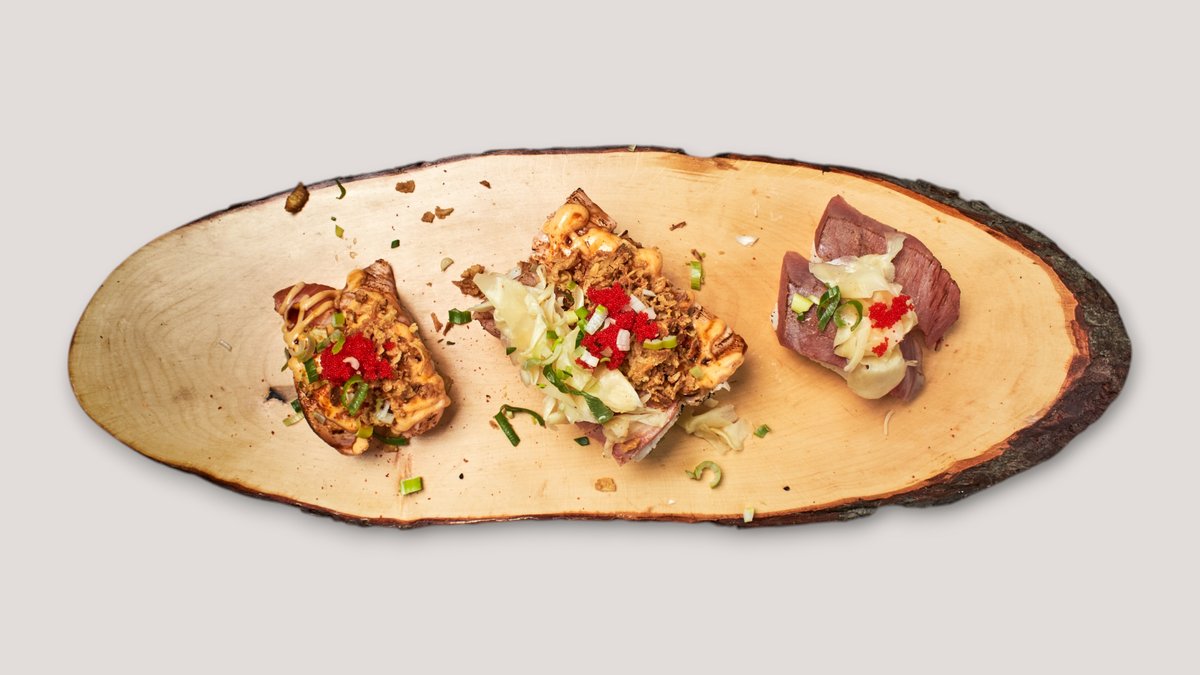 12 Stück, flambiert 4x Yuma Special Inside Out 2x Maguro Tataki 4x Katagi Inside Out 2x Shake Aburi Nigiri