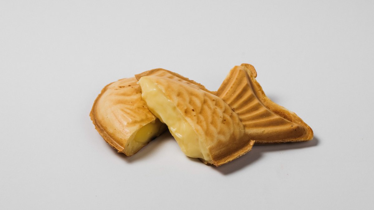 Vegetarisch. Japanische Waffeln in Form einer Seebrasse gefĂĽllt mit Puddingcreme. Die Vanillepuddingcreme wird nach Originalrezept vor Ort handgefertigt.