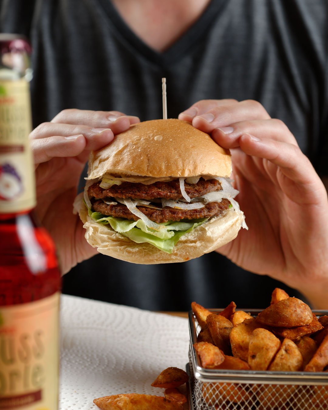 SĂĽĂźkartoffel-Bohnen-Patty doppelt, Salat, Gurken, Zwiebeln, Ketchup