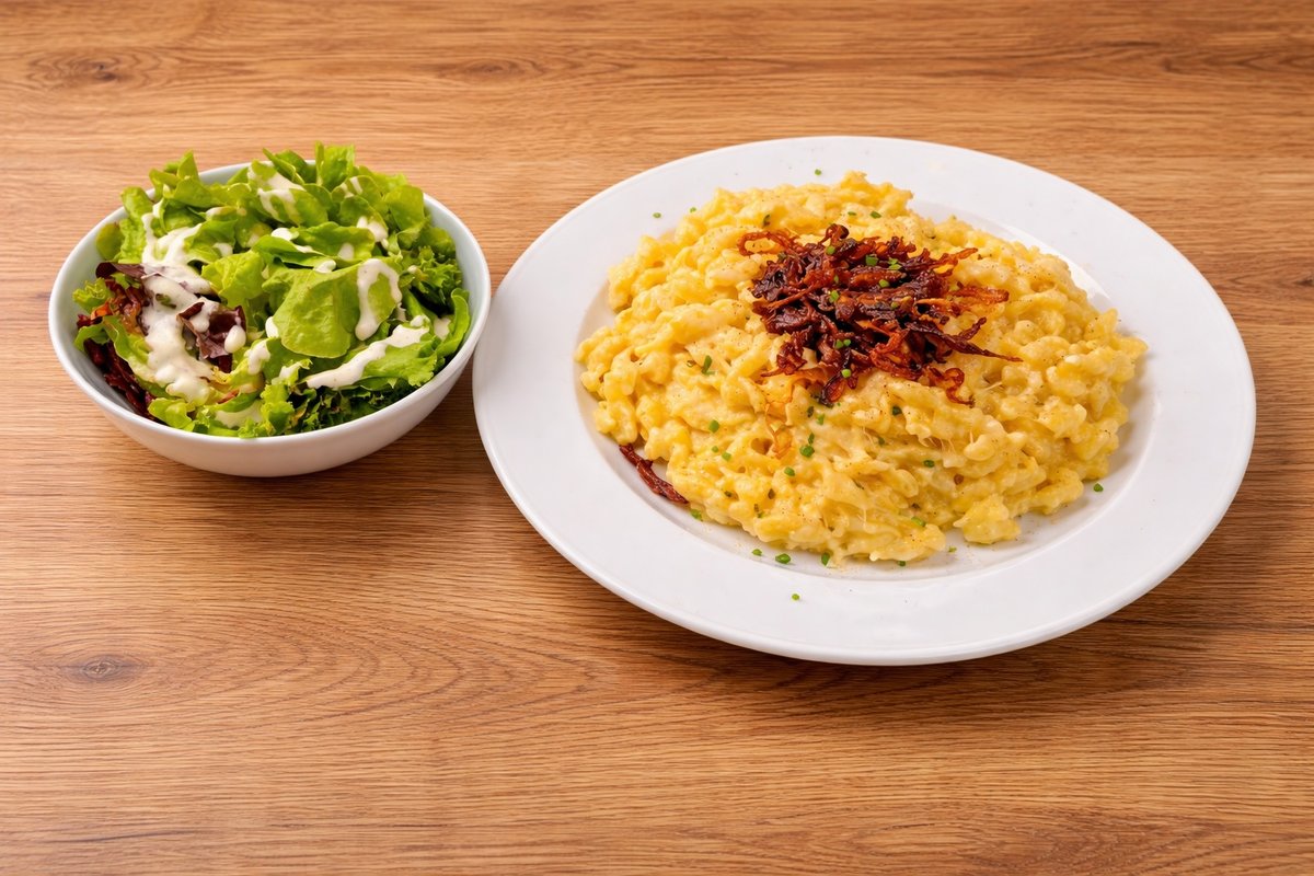 mit authentischen Allgäuer Käsespätzle, hausgemachten Eierspätzle, Käse, Röstzwiebeln und Salat