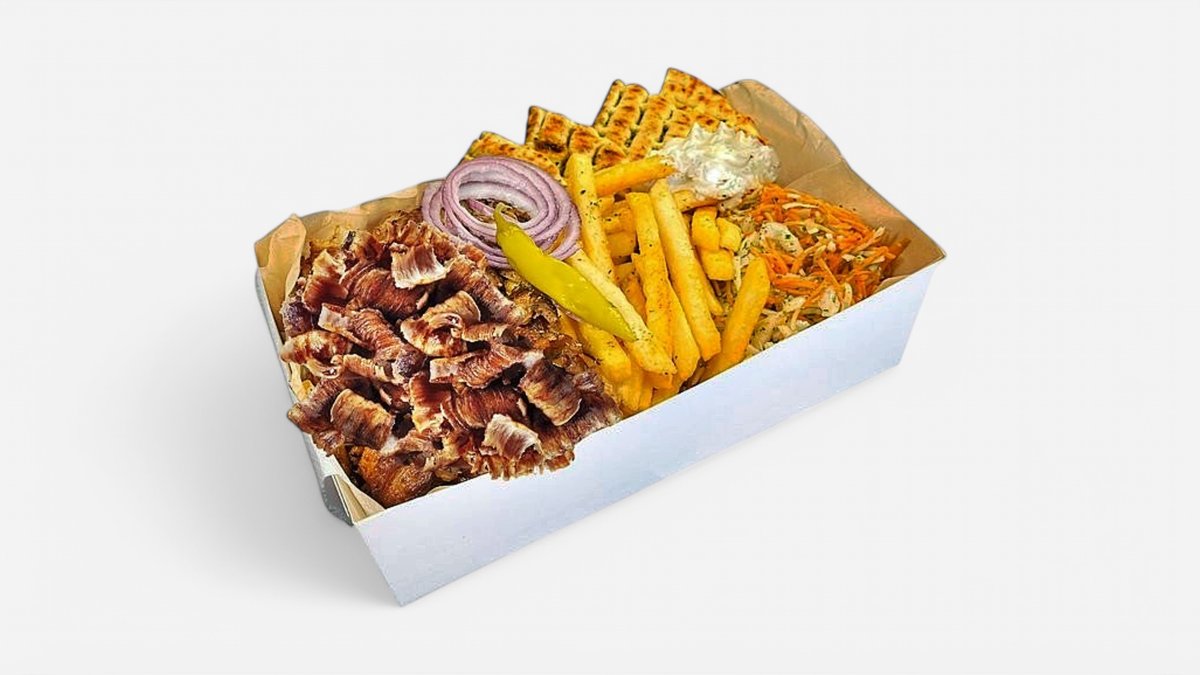 Fein geschnittenes Schweine- oder Hähnchen-Gyros, Crunchy Fries, Pita Brot, Krautsalat, roten Zwiebeln und mit original griechischem Joghurt oder Tsatsiki