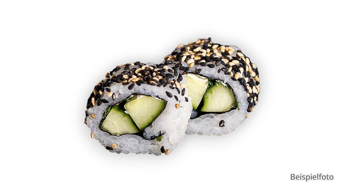 3x Nigiri Garnele, Omelett, Inari und Tofu 6x Maki Gurken 8x California Roll Surimi und Avocado, außen Flugfischrogen