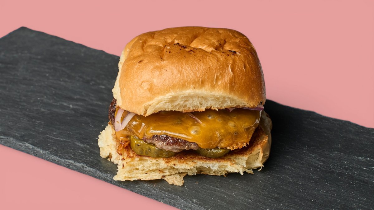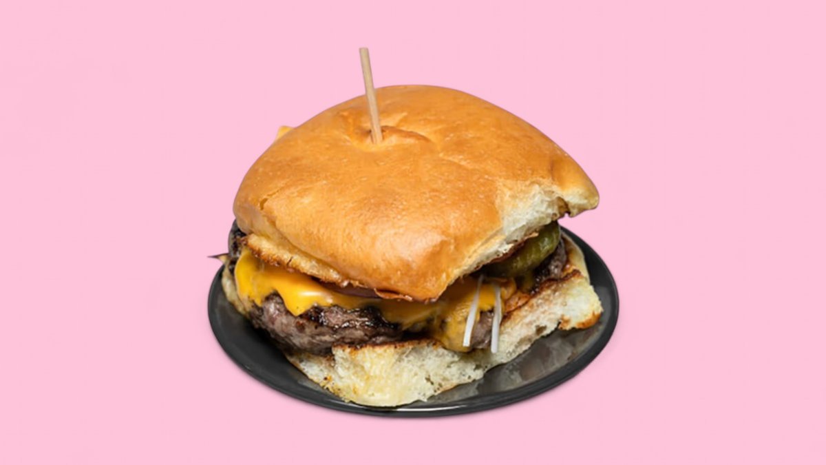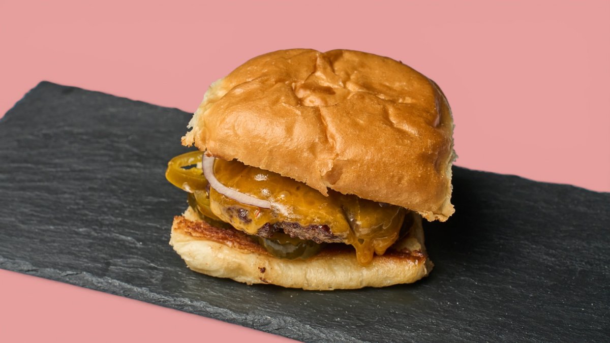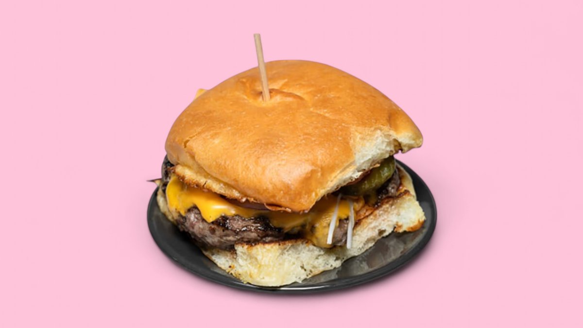 mit 125 g Rind, Briochebrötchen, doppeltem Cheddar, Ketchup, Senf, roten Zwiebeln und Essiggurken