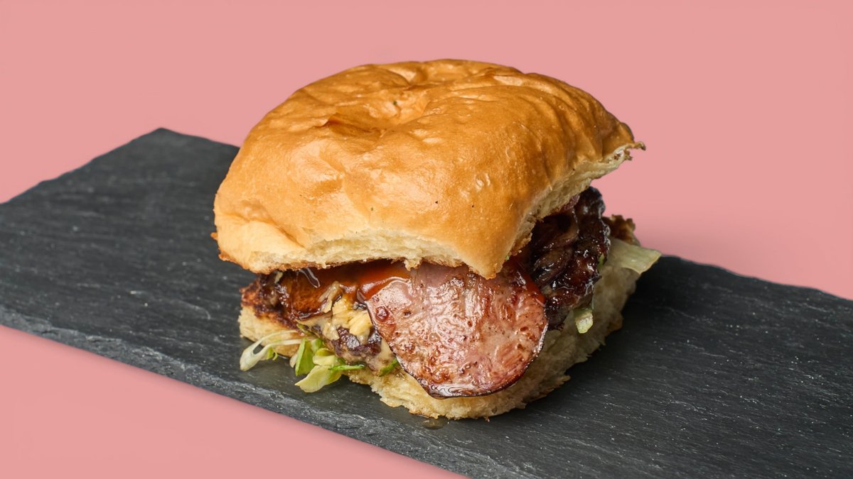 mit 125 g Rind, Brioche Brötchen, Barbecuesoße, Mayonnaise, Old Amsterdam, gerösteten Zwiebeln, Truthahnbacon, Tomaten und Salat