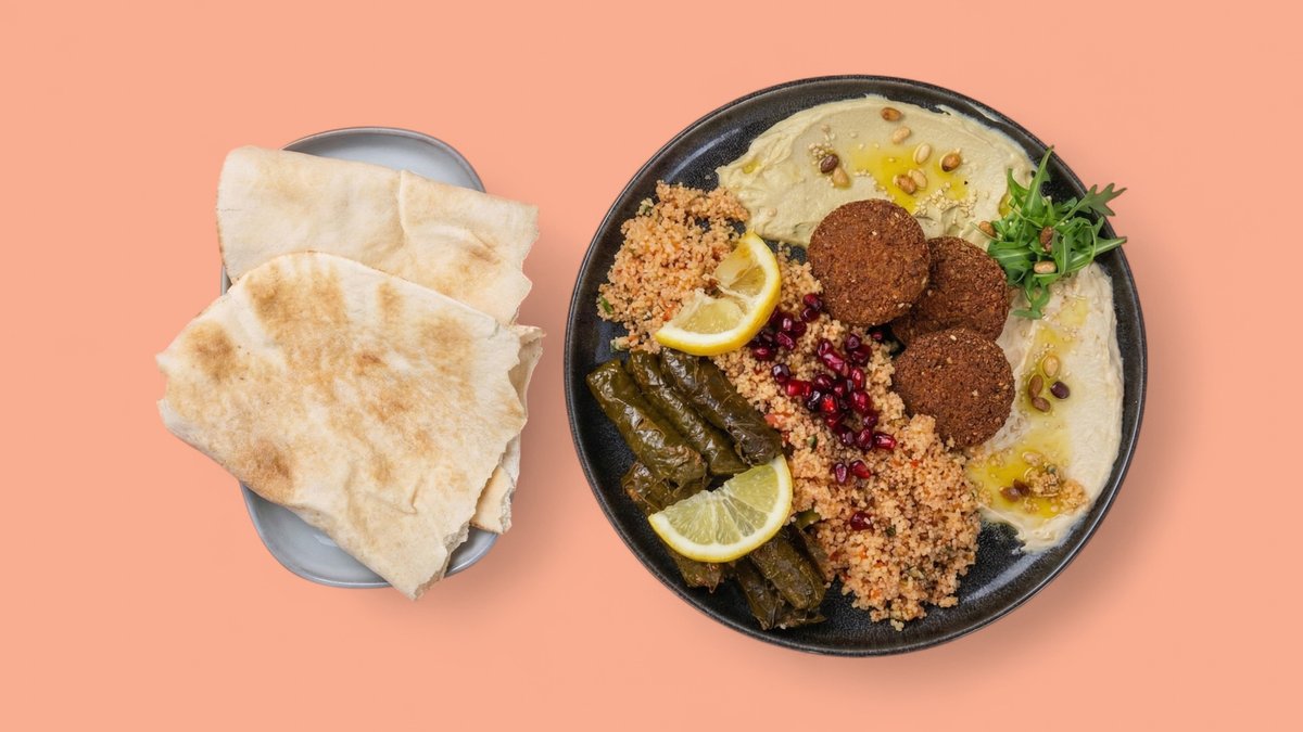 alle Gerichte werden mit Hummus, Couscous, Fladenbrot und Falafel zubereitet („Kibbeh-Teller” wird ohne Falafel zubereitet)