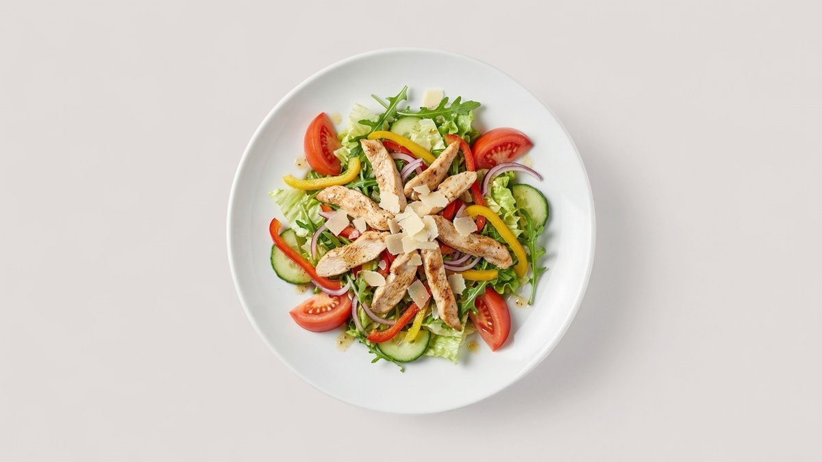 mit Salat, Hähnchenstreifen, Rucola, Tomaten, Paprika, roten Zwiebeln, Gurken und gehobeltem Parmesan