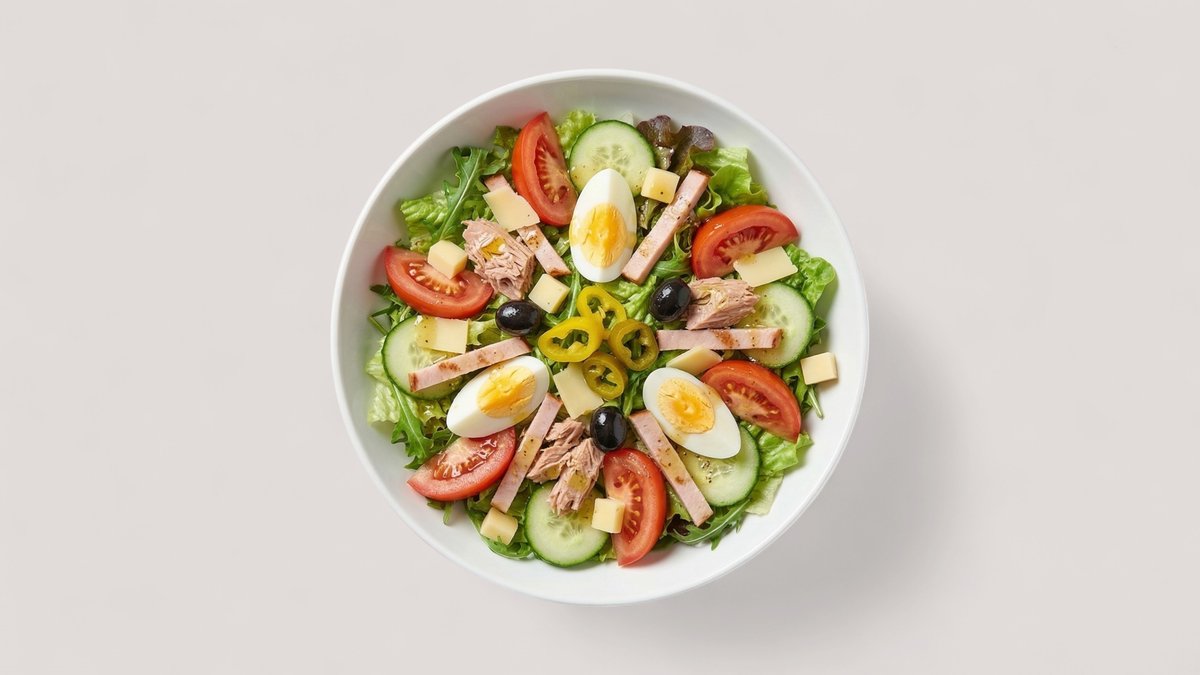 mit Tomaten, Gurken, Thunfisch, Truthahnschinken, Käse, Oliven, Peperoni und Ei