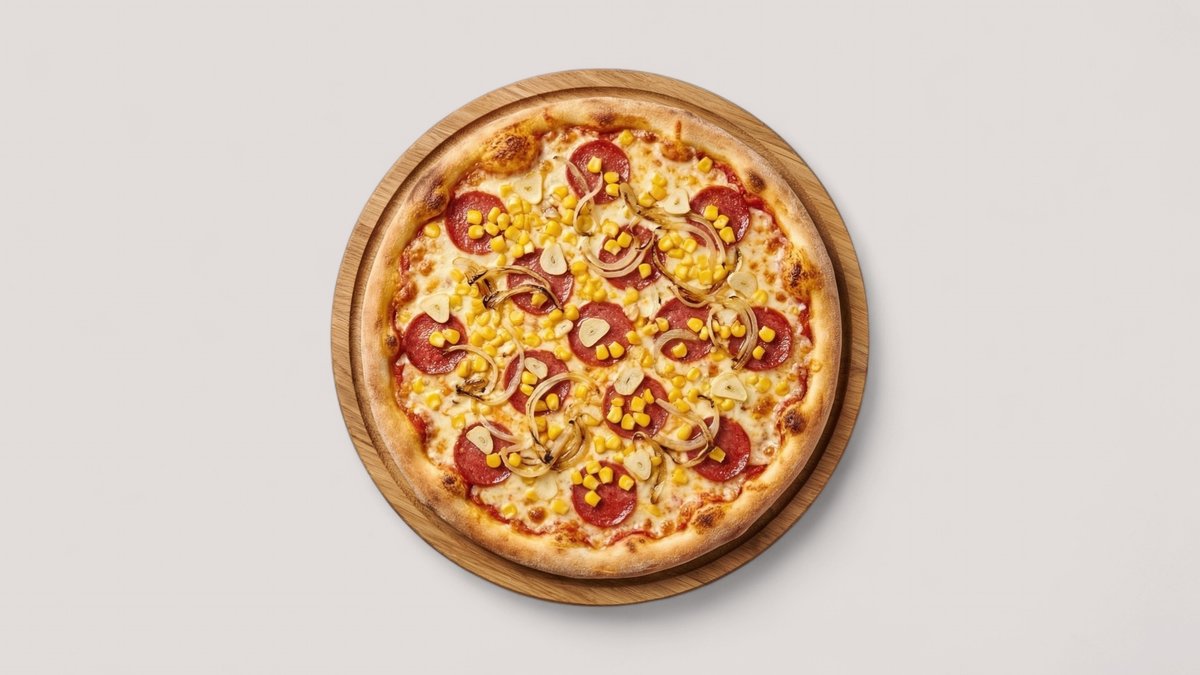 mit Mais, Knoblauch, Peperoni und Zwiebeln