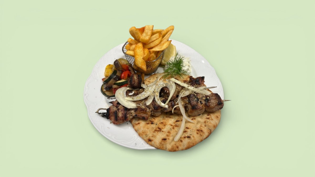 1x Putenspieß 1x Schweinespieß 1x Lammkotelett 1x Suzukaki mit frittierten Kartoffeln, extra Beilage und Salat