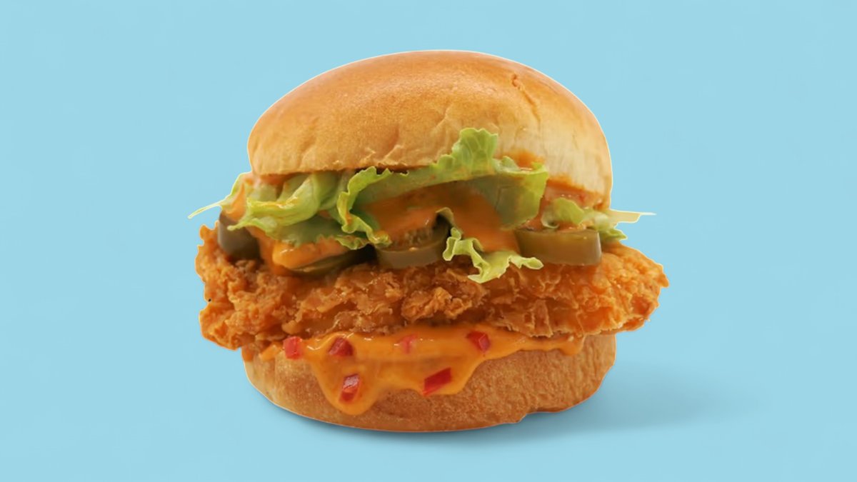 mit 100% naturgewachsenes Hähnchenbrustfilet, von Hand paniert Brioche Style Bun, PomPom Hot Hähnchensoße, knackigem Salat und Jalapeños