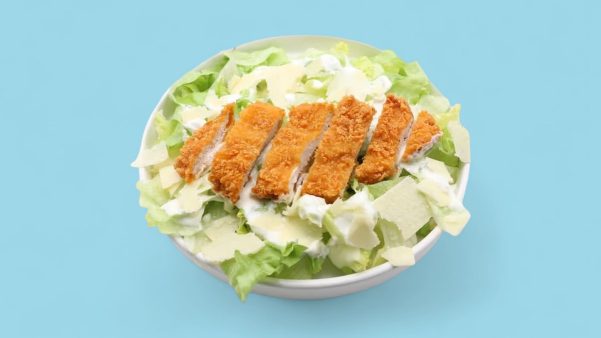 knackiger Salat mit Streifen von der Hähnchenbrust (naturgewachsen, handpaniert), Parmesan Flakes und Joghurt Dressing