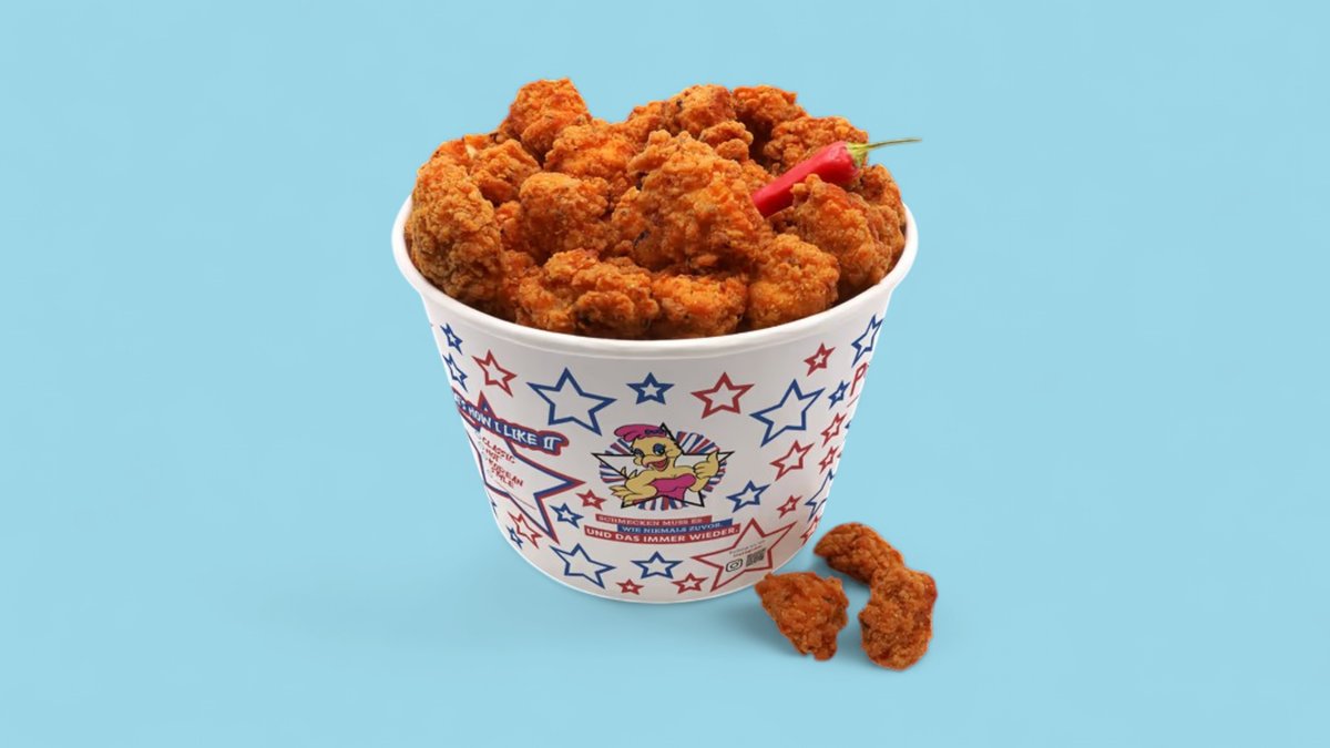 eine Box voll 300 g, saftiges Hähnchenbrustfilet in scharf-vollwürziger Panade