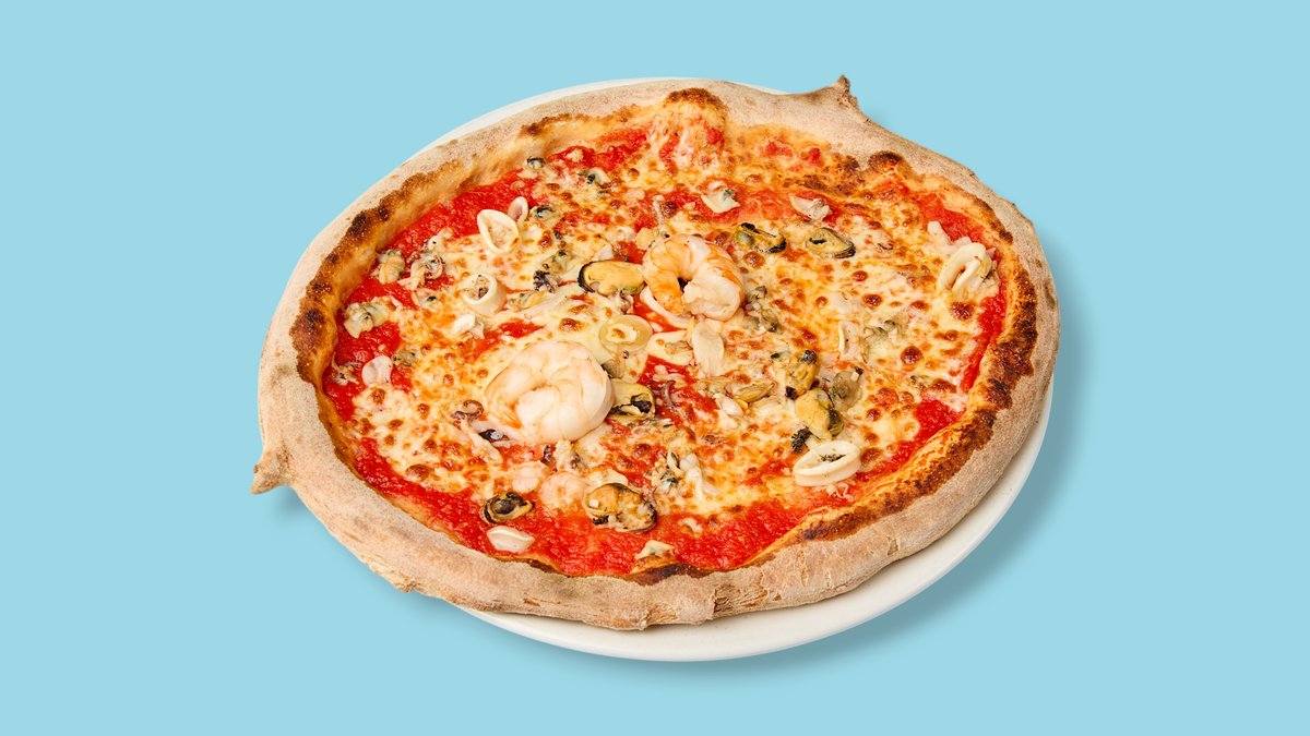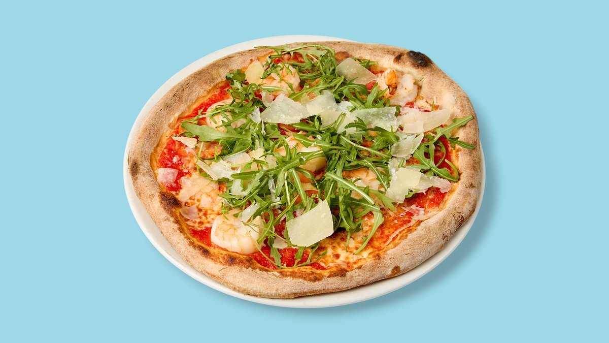 Tomatensugo, Garnelen, Rucola, Kirschtomaten, Knoblauch, Grana Padano, Fior di Latte