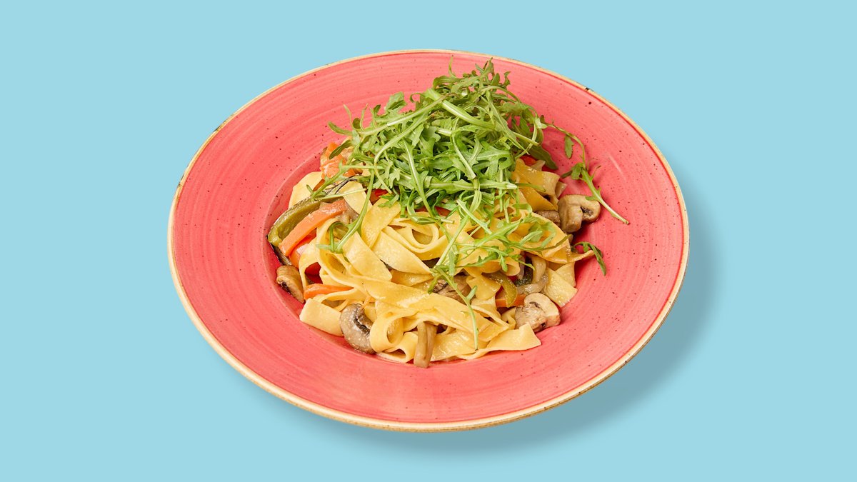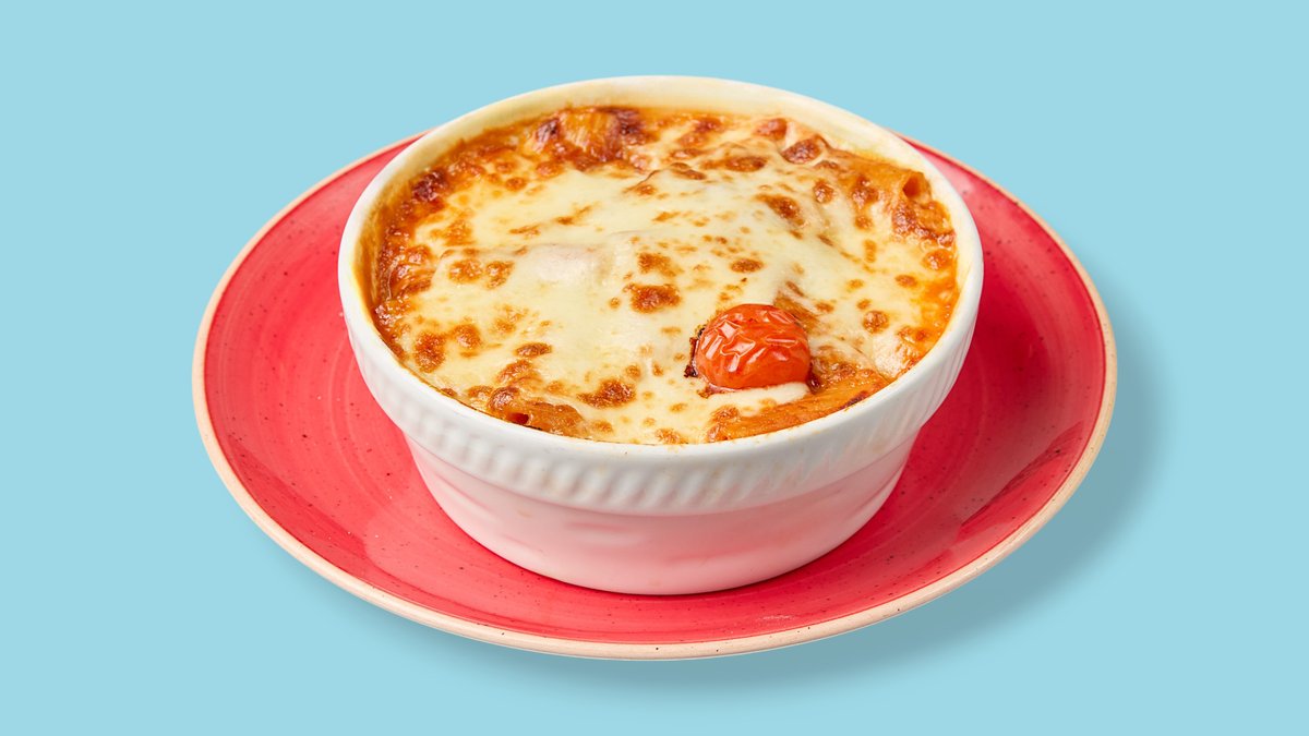 mit Aurorasauce, Erbsen, Champignons – im Ofen mit Fior di Latte überbacken