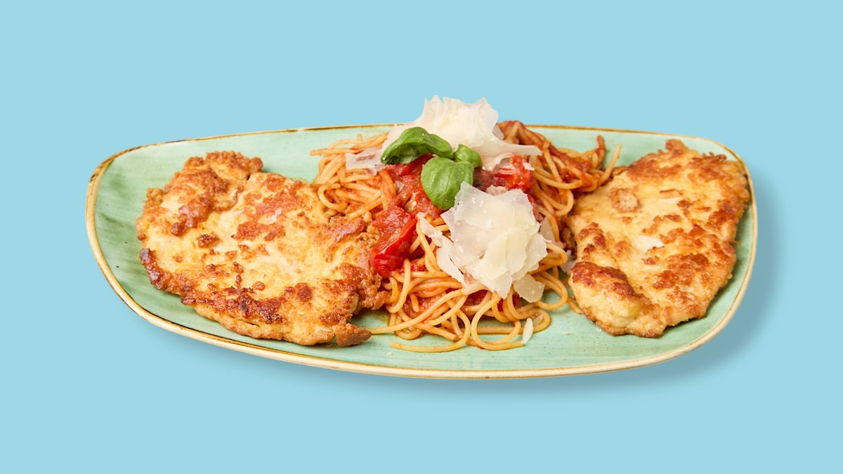 mit Tomatensugo und Hähnchenschnitzel in Ei-Grana Padano Hülle