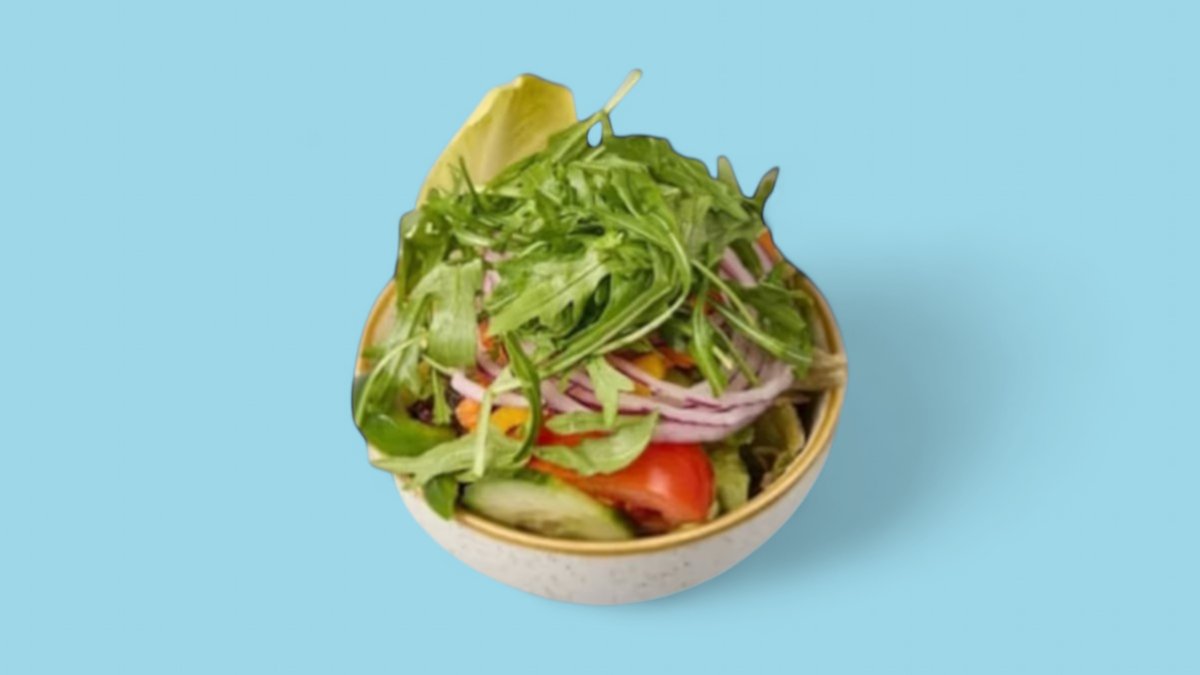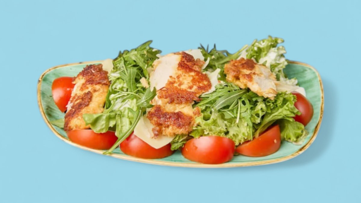 bunte Blattsalate mit Hähnchenschnitzel in Ei-Grana Padano Hülle, Tomaten, Joghurt Dressing und frischen Kräutern