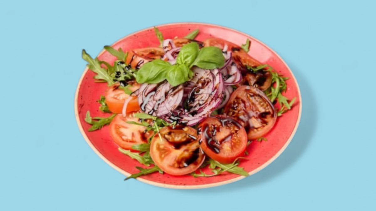 Tomatensalat mit roten Zwiebeln und Balsamicodressing, Basilikum