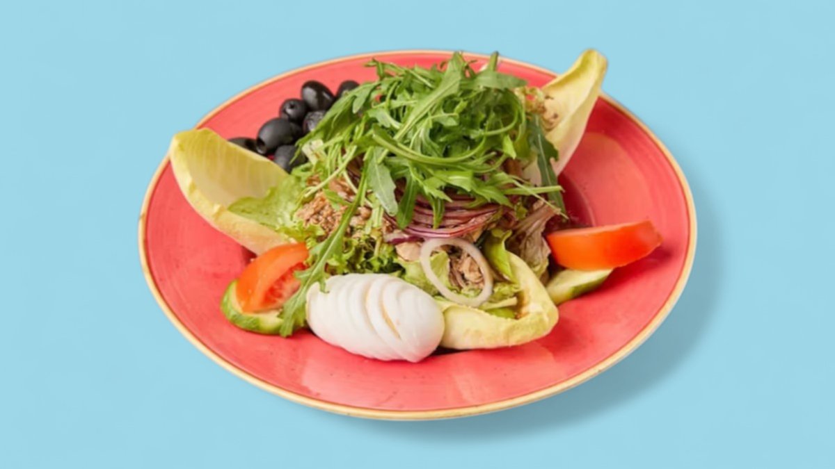 bunte Blattsalate mit Thunfisch, Ei, Tomaten, Oliven, Balsamico Dressing und Zwiebeln