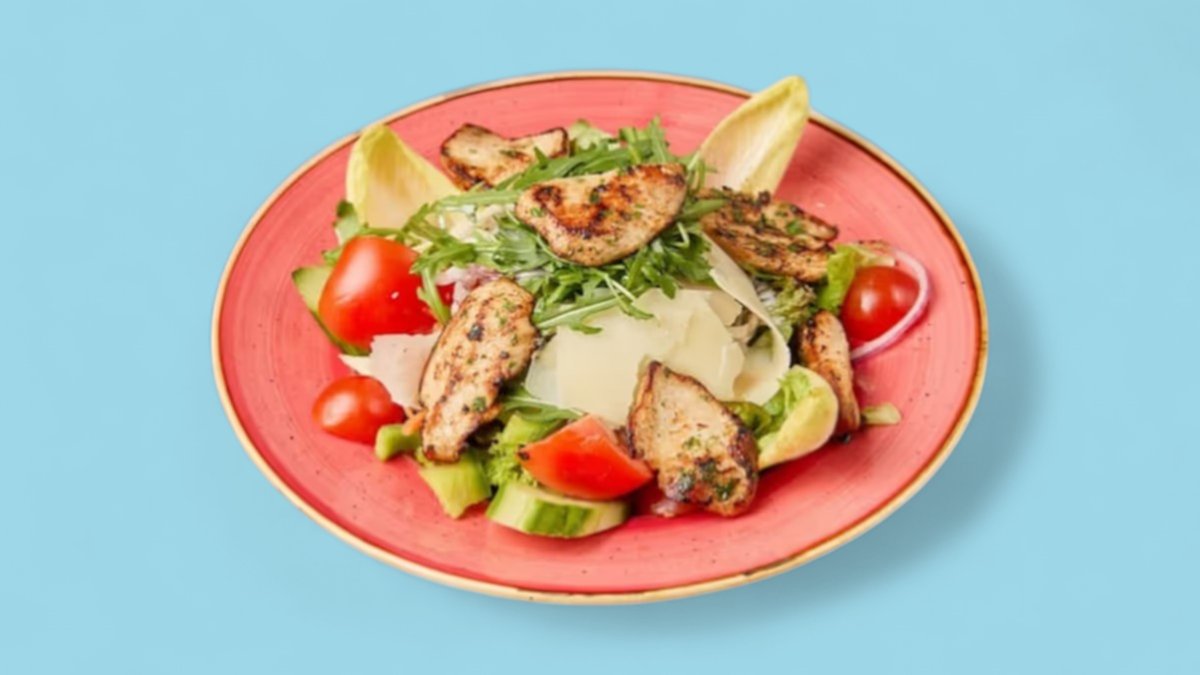 bunte Blattsalate mit gegrillter Hähnchenbrust, Kirschtomaten, Joghurt Dressing und Grana Padano