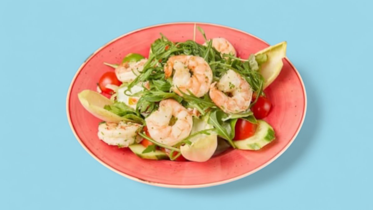 bunte Blattsalate mit gegrillten Garnelen, Limette, Joghurt Dressing und frischen Kräutern