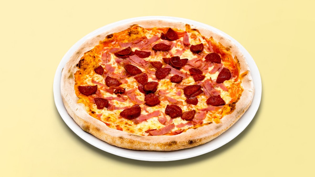 mit Salami, Schinken, scharfen Peperoni, frischen Pilzen, Zwiebeln, bunten Paprika, Jalapeños, Oliven, Spiegelei und extra Käse