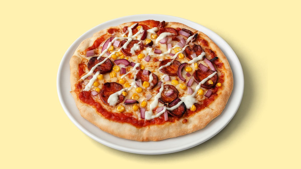 mit Sahnesoße, Sucuk, Zwiebeln, Mais und scharfem Chilipulver