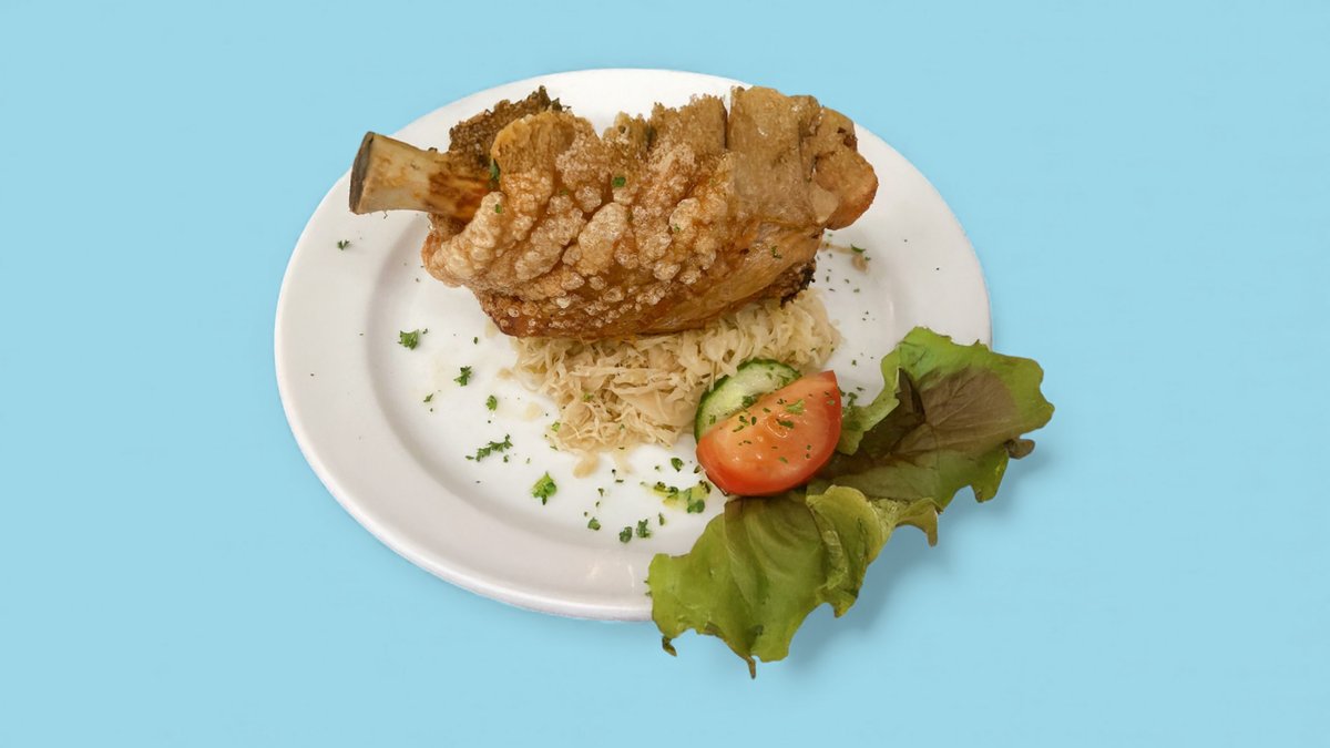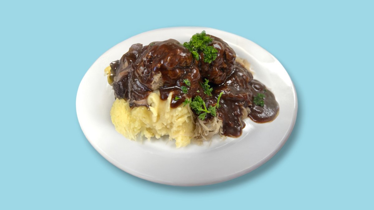 mit Leberknödeln vom Schwein, hausgemachter Dunkel-Bier-Soße, Sauerkraut und Kartoffelpüree Enthält Alkohol, für Kinder und schwangere Frauen nicht geeignet