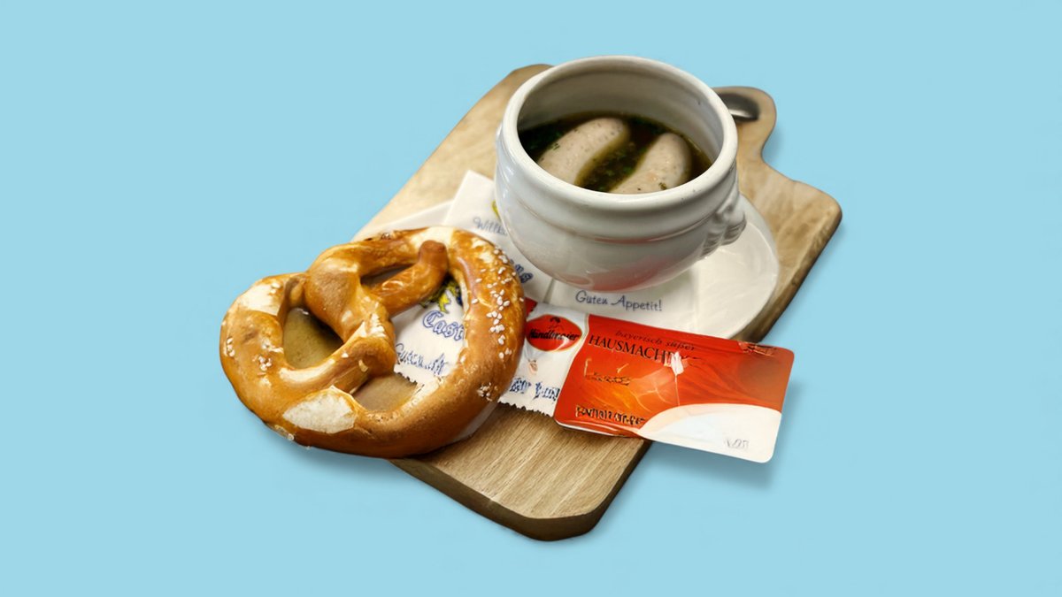 mit Weißwürste vom Schwein, süßem Senf und Laugenbrezel