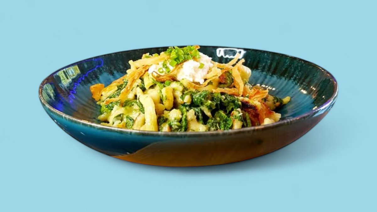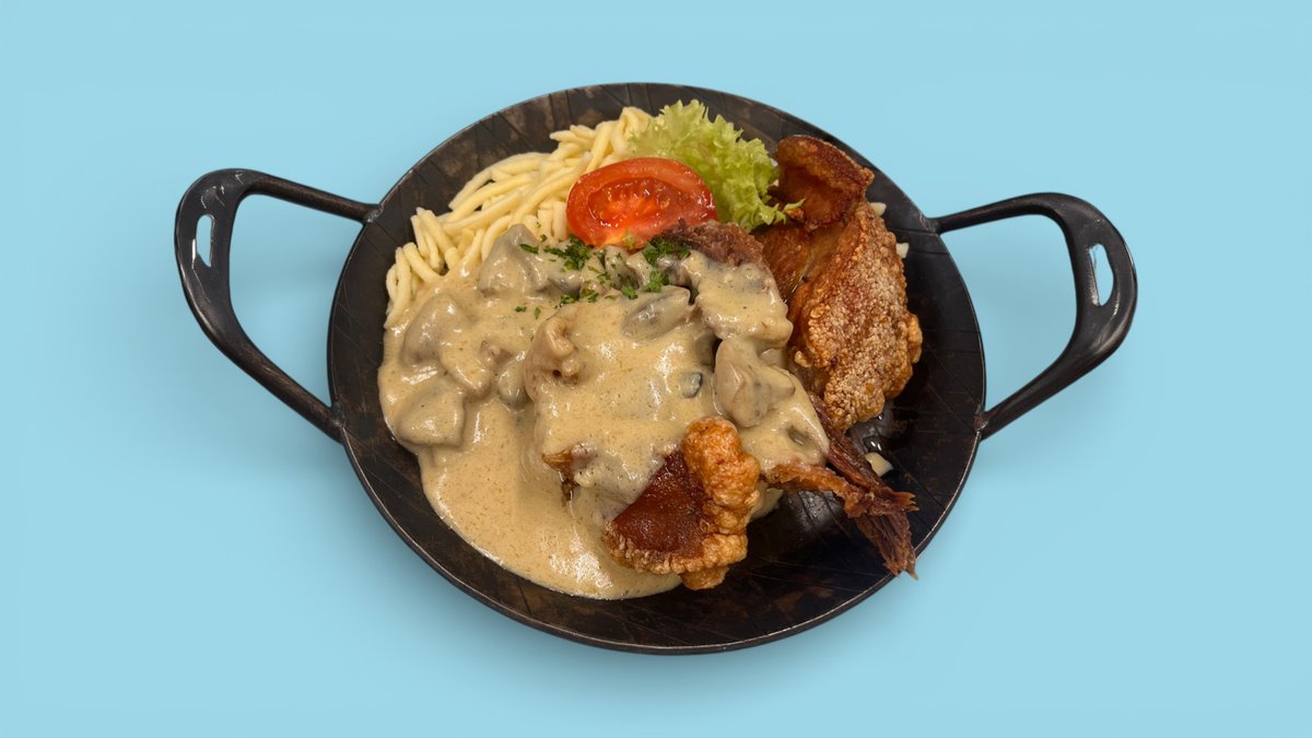 Schweinehaxenfleisch frisch vom Knochen gelöst, mit Spätzle und Champignon-Rahmsoße