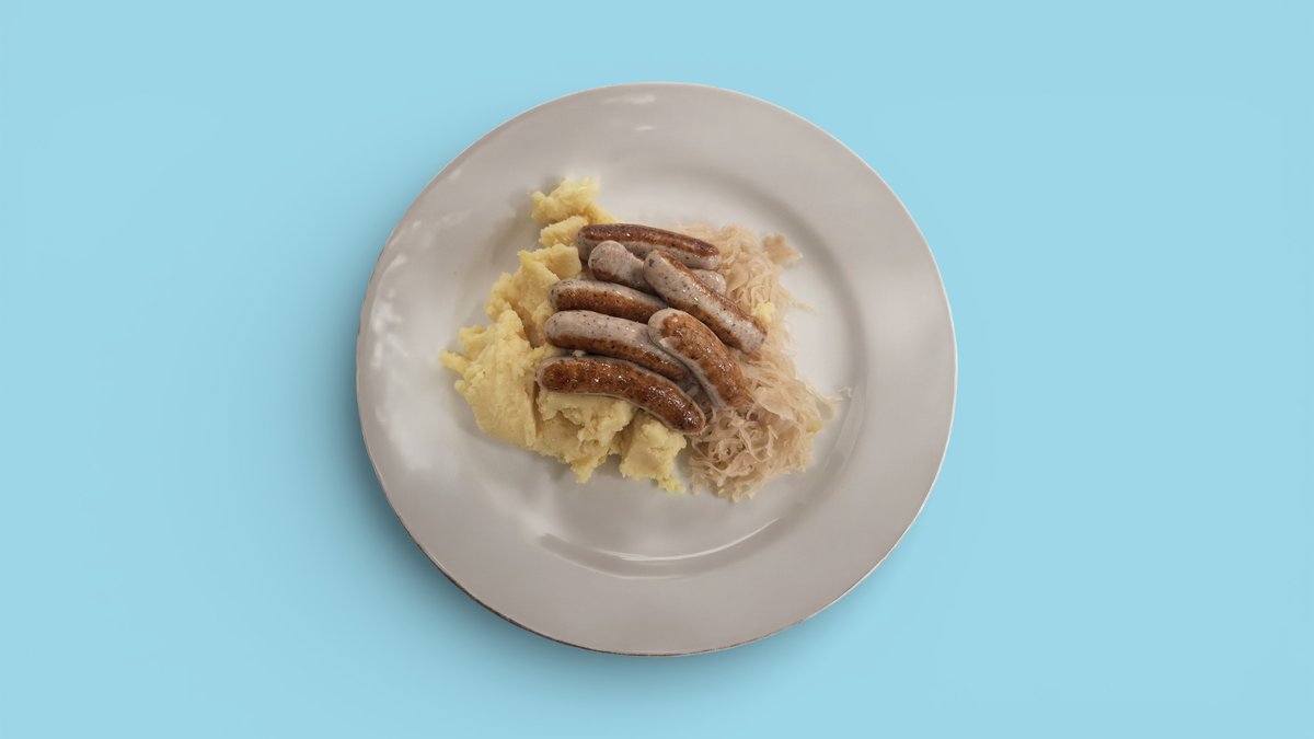 mit Rostbratwürstchen vom Schwein, Sauerkraut und Kartoffelpüree