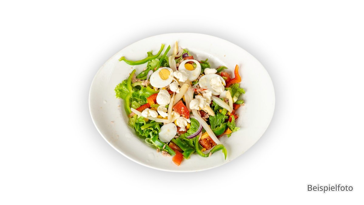 mit Eisbergsalat, Gurken, Tomaten, Rucolasalat, Käse, Thunfisch, Ei, gebratenen Putenfilets und Pilzen
