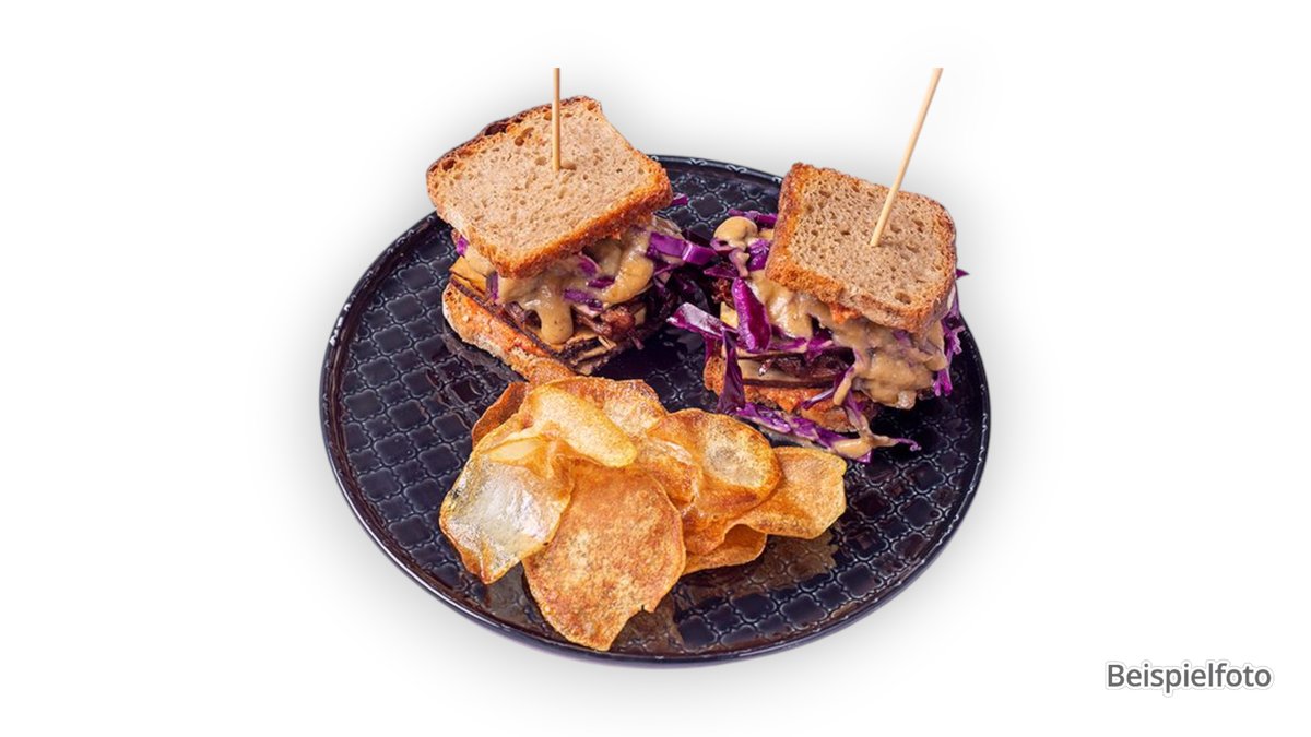 mit Rindfleisch Patty, Bacon, Cheese, Salat, Tomate, Barbecuesoße und House-Ranchstyle-Dressing, dazu Salted Tortilla Chips