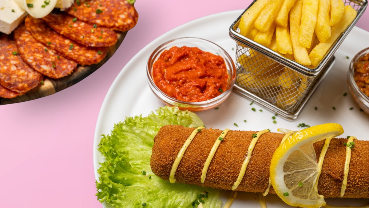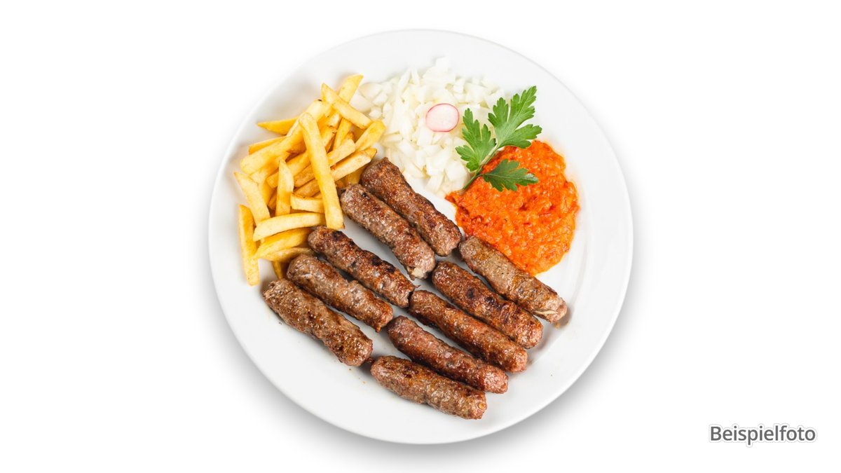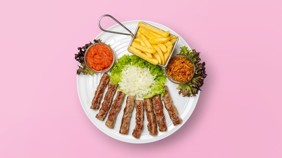 für 2 Personen Pljeskavica mit einer Fleischsorte deiner Wahl, Hühnerspieß, Schweinespieße, Cevapcici vom Rind, gegrillter Bauchspeck vom Schwein, Wurst vom Schwein, Wiener Schnitzel vom Schwein, Zwiebeln, Pommes frites und Ajvar